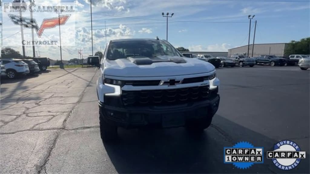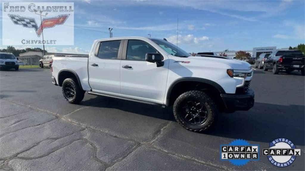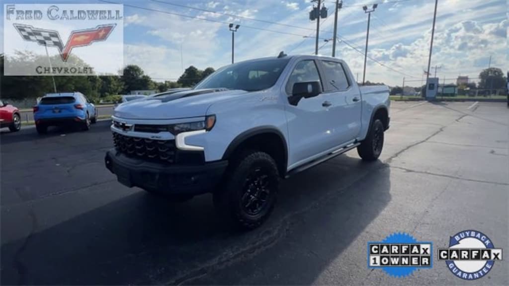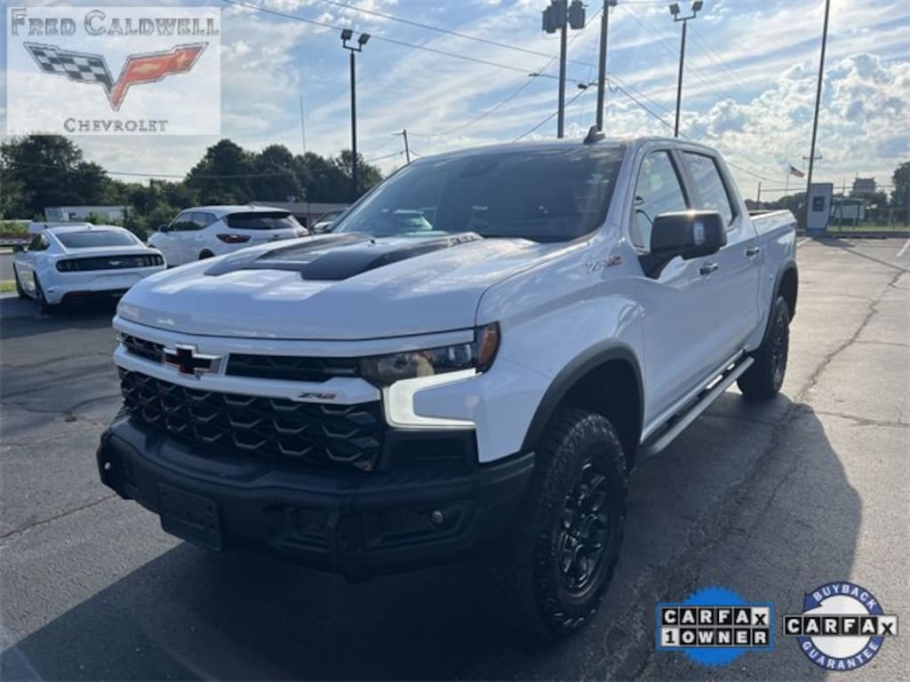 CARFAX One-Owner. Clean CARFAX. Certified. Summit White 2023 Chevrolet Silverado 1500 ZR2 4WD 10-Speed Automatic EcoTec3 6.2L V8 10-Speed Automatic, 4WD, Jet Black/Graystone Leather, 10-Way Power Driver Seat w/Lumbar, 10-Way Power Passenger Seat Adjuster w/Lumbar, 12.3 Multicolor Reconfigurable Digital Display, 120-Volt Bed Mounted Power Outlet, 120-Volt Instrument Panel Power Outlet, 15 Diagonal Multicolor Head-Up Display, 170 Amp Alternator, 2 USB Data Ports, 2nd Row Heated Outboard Seats, 3.23 Rear Axle Ratio, 4-Wheel Disc Brakes, 7 Speakers, ABS brakes, Adaptive Cruise Control, AEV Front Bumper, AEV Fuel Tank Skid Plate, AEV Rear Bumper, Air Conditioning, All-Weather AEV Floor Liners (LPO), All-Weather Floor Liner (LPO), Alloy wheels, AM/FM radio: SiriusXM with 360L, Apple CarPlay/Android Auto, Auto High-beam Headlights, Auto-dimming door mirrors, Auto-Dimming Inside Rear-View Mirror, Auto-dimming Rear-View mirror, Auto-Locking Rear Differential, Automatic Emergency Braking, Automatic temperature control, Bed View Camera, Bluetooth® For Phone, Brake assist, Chevrolet Connected Access Capable, Chevytec Spray-On Black Bedliner, Color-Keyed Carpeting Floor Covering, Compass, Deep-Tinted Glass, Delay-off headlights, Driver door bin, Driver Memory, Driver vanity mirror, Dual Exhaust, Dual front impact airbags, Dual front side impact airbags, Dual Rear USB Ports (Charge Only), Electric Rear-Window Defogger, Electrical Steering Column Lock, Electronic Cruise Control, Electronic Stability Control, Electronic Transmission Range Selector Shifter, EZ Lift Power Lock & Release Tailgate, Floor Mounted Center Console, Following Distance Indicator, Forward Collision Alert, Front anti-roll bar, Front Bucket Seats, Front Center Armrest, Front dual zone A/C, Front fog lights, Front LED Fog Lamps, Front Pedestrian Braking, Front Rainsensing Wipers, Front reading lights, Front wheel independent suspension, Fully automatic headlights, Garage door transmitter, HD Surround Vision, Heated door mirrors, Heated Driver & Front Outboard Passenger Seats, Heated front seats, Heated rear seats, Heated Steering Wheel, Heated steering wheel, Heavy-Duty Air Filter, High Gloss Black Mirror Caps, Hill Descent Control, Hitch Guidance, Hitch Guidance w/Hitch View, Illuminated entry, Integrated Trailer Brake Controller, IntelliBeam Automatic High Beam On/Off, Keyless Open & Start, Lane Keep Assist w/Lane Departure Warning, LED Cargo Area Lighting, Low tire pressure warning, Manual Tilt/Telescoping Steering Column, Memory seat, Multi-Flex Tailgate, Not Equipped w/Steering Column Lock, Occupant sensing airbag, OnStar & Chevrolet Connected Services Capable, Outside Heated Power-Adjustable Mirrors, Outside temperature display, Overhead airbag, Overhead console, Panic alarm, Passenger door bin, Passenger vanity mirror, Perforated Leather Seat Trim, Performance Red Recovery Hooks, Perimeter Lighting, Power door mirrors, Power driver seat, Power Front Passenger Windows w/Express Up/Down, Power Front Windows w/Driver Express Up/Down, Power passenger seat, Power Rear Windows w/Express Down, Power Sliding Rear Window w/Rear Defogger, Power steering, Power Sunroof, Power Tilt & Telescoping Steering Column, Power windows, Preferred Equipment Group 3LT, Premium audio system: Chevrolet Infotainment 3 Premium, Premium Bose 7-Speaker Sound System, Radio data system, Radio: Chevrolet Infotainment 3 Premium System, Rain sensing wipers, Rear Camera Mirror, Rear Cross Traffic Alert-Braking, Rear Park Assist, Rear Parking Sensors, Rear Pedestrian Alert, Rear reading lights, Rear seat center armrest, Rear step bumper, Rear Wheelhouse Liners, Rear window defroster, Remote keyless entry, Remote Vehicle Starter System, Rocker Protector (LPO), Safety Alert Seat, Security system, SiriusXM w/360L, Speed control, Speed-sensing steering, Split folding rear seat, Standard Tailgate, Steering Wheel Audio Controls, Steering wheel mounted audio c