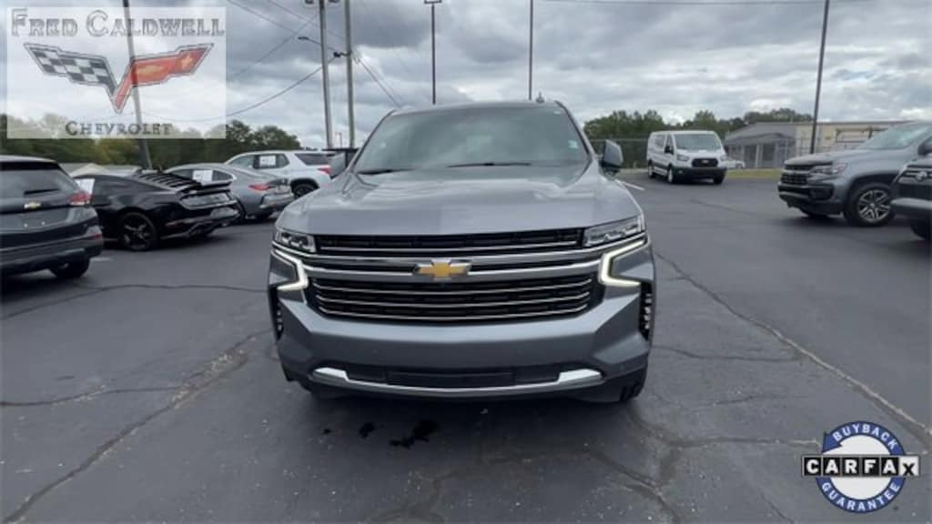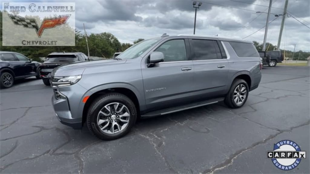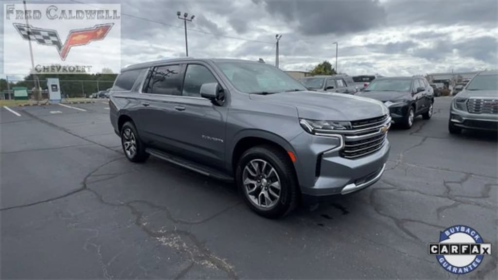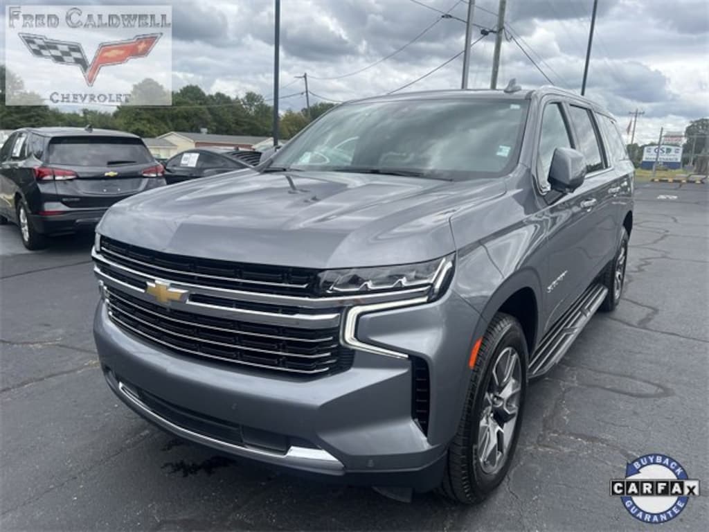 Clean CARFAX. Satin Steel Metallic 2021 Chevrolet Suburban LT 4WD 10-Speed Automatic with Overdrive EcoTec3 5.3L V8 10-Way Power Driver & Passenger Seat Adjusters, 1st & 2nd Row Color-Keyed Carpeted Floor Mats, 2 USB Data Ports, 2-Speed Active Electronic AutoTrac Transfer Case, 2nd Row Pwr Release 60/40 Split-Folding Bench Seat, 3.23 Rear Axle Ratio, 3rd Row 60/40 Power-Folding Split-Bench, 3rd row seats: split-bench, 4-Wheel Disc Brakes, 9 Speakers, ABS brakes, Advanced Trailering Package, Advanced Trailering System, Air Conditioning, Alloy wheels, AM/FM radio: SiriusXM with 360L, Apple CarPlay/Android Auto, Auto High-beam Headlights, Auto-Dimming Inside Rear-View Mirror, Auto-dimming Rear-View mirror, Automatic Heated Steering Wheel, Automatic temperature control, Bose 9-Speaker Stereo Audio System Feature, Brake assist, Bright Front & Rear Door Sill Plates, Bumpers: body-color, Color-Keyed Carpeting Floor Covering, Compass, Delay-off headlights, Driver & Front Outboard Passenger Airbags, Driver Alert Package, Driver door bin, Driver vanity mirror, Dual front impact airbags, Dual front side impact airbags, Dual-Pane Power Panoramic Sunroof, Electronic Stability Control, Emergency communication system: OnStar and Chevrolet connected services capable, Extra Capacity Cooling System, Floor Console w/Storage Area, Four wheel independent suspension, Front & Rear Park Assist, Front anti-roll bar, Front Bucket Seats, Front Center Armrest, Front dual zone A/C, Front reading lights, Fully automatic headlights, Garage door transmitter, Hands-Free Rear Power Programmable Liftgate, HD Radio, HD Surround Vision, Heated 2nd Row Outboard Seats, Heated door mirrors, Heated Driver & Front Passenger Seats, Heated front seats, Hitch Guidance w/Hitch View, Illuminated entry, Infotainment Display, Integrated Trailer Brake Controller, Lane Change Alert w/Side Blind Zone Alert, Lane Keep Assist w/Lane Departure Warning, Leather Seating Surfaces, Leather steering wheel, Leather-Wrapped Steering Wheel, LED Daytime Running Lamps, Low tire pressure warning, LT Signature Package, Luxury Package, Max Trailering Package, Memory seat, Memory Settings, Memory Settings For Driver, Occupant sensing airbag, Outside Heated Power-Adjustable Mirrors, Outside temperature display, Overhead airbag, Overhead console, Panic alarm, Passenger door bin, Passenger vanity mirror, Power door mirrors, Power driver seat, Power Liftgate, Power passenger seat, Power Release 2nd Row Bucket Seats, Power steering, Power Tilt & Telescopic Steering Column, Power windows, Preferred Equipment Group 1LT, Premium audio system: Chevrolet Infotainment 3 Plus, Premium Smooth Ride Suspension, Radio: Chevrolet Infotainment 3 Plus System, Rain sensing wipers, Rear air conditioning, Rear anti-roll bar, Rear Cross Traffic Alert, Rear Pedestrian Alert, Rear reading lights, Rear seat center armrest, Rear window defroster, Rear window wiper, Remote keyless entry, Remote Start, Roof rack: rails only, Security system, SiriusXM Radio w/360L, Speed control, Speed-sensing steering, Split folding rear seat, Spoiler, Steering wheel mounted audio controls, Tachometer, Telescoping steering wheel, Tilt steering wheel, Traction control, Trip computer, Universal Home Remote, Variably intermittent wipers, Voltmeter, Wheels: 18 x 8.5 Bright Silver Painted Aluminum, Wheels: 20 x 9 Painted Aluminum.