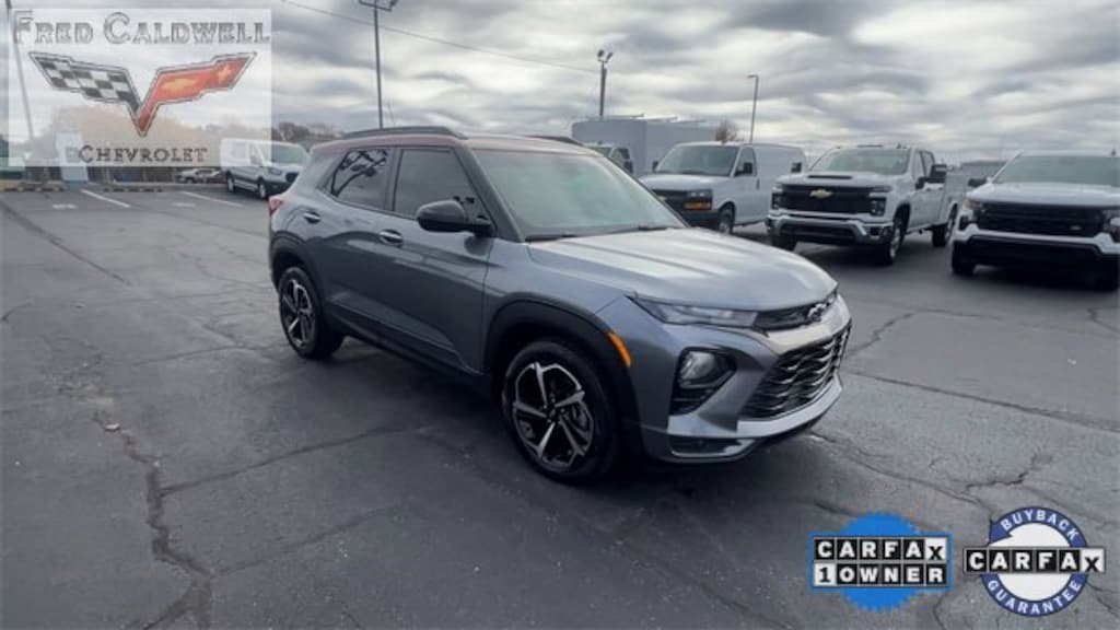 CARFAX One-Owner. Satin Steel Metallic 2022 Chevrolet TrailBlazer RS FWD CVT 1.3L Ecotec Turbo DOHC SIDI w/VVT 1 Type-A & 1 Type-C USB Charging-Only Ports, 120-Volt Power Outlet, 2-Way Power Driver Lumbar Seat Adjuster, 4-Way Manual Front Passenger Seat Adjuster, 4-Wheel Disc Brakes, 4.2 Diagonal Multi-Color Driver Info Center, 5.45 Axle Ratio, 6 Speakers, 6-Speaker Audio System Feature, 8-Way Power Driver Seat Adjuster, 8 Diagonal Color Touchscreen Display, ABS brakes, Adaptive Cruise Control, Air Conditioning, Alloy wheels, AM/FM radio: SiriusXM, Auto High-beam Headlights, Bose Premium 7-Speaker Audio System Feature, Brake assist, Bumpers: body-color, Cabin Humidity Sensor, Cloth w/Leatherette Seat Trim, Compass, Convenience Package, Crimson Metallic Two-Tone Roof, Delay-off headlights, Driver & Front Passenger Illuminated Vanity Mirrors, Driver Confidence Package, Driver door bin, Driver vanity mirror, Dual front impact airbags, Dual front side impact airbags, Electronic Stability Control, Emergency communication system: OnStar and Chevrolet connected services capable, Exterior Parking Camera Rear, Flat-Folding Front Passenger Seatback, Front anti-roll bar, Front Bucket Seats, Front Center Armrest, Front fog lights, Front License Plate Bracket, Front reading lights, Front wheel independent suspension, Fully automatic headlights, HD Radio, HD Rear Vision Camera, Heated door mirrors, Heated Driver & Front Passenger Seats, Heated front seats, Heated Steering Wheel, Heated steering wheel, Illuminated entry, Inside Rear-View Auto-Dimming Mirror, Knee airbag, Lane Change Alert w/Side Blind Zone Alert, Leather Shift Knob, Leather steering wheel, LED Headlamps, Low tire pressure warning, Memory Card Receptacle, Not Equipped w/Driver & Fr Passenger Heated Seats, Not Equipped w/Rear Park Assist, Occupant sensing airbag, Overhead airbag, Overhead console, Panic alarm, Passenger door bin, Passenger vanity mirror, Power door mirrors, Power driver seat, Power steering, Power windows, Preferred Equipment Group 1RS, Radio data system, Radio: Chevrolet Infotainment 3 Plus System, Radio: Chevrolet Infotainment 3 System, Rear Cross Traffic Alert, Rear Park Assist, Rear seat center armrest, Rear side impact airbag, Rear window defroster, Rear window wiper, Remote keyless entry, Ride & Handling Suspension, Roof rack: rails only, Security system, Single-Zone Auto Climate Control Air Conditioning, SiriusXM Radio, SiriusXM w/360L, Speed control, Split folding rear seat, Spoiler, Steering wheel mounted audio controls, Tachometer, Technology Package, Telescoping steering wheel, Tilt steering wheel, Traction control, Trip computer, Variably intermittent wipers, Wheels: 18 High Gloss Black Machined Aluminum, Wireless Apple CarPlay/Android Auto, Wireless Charging.