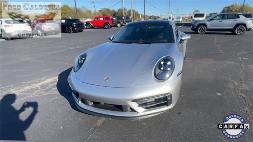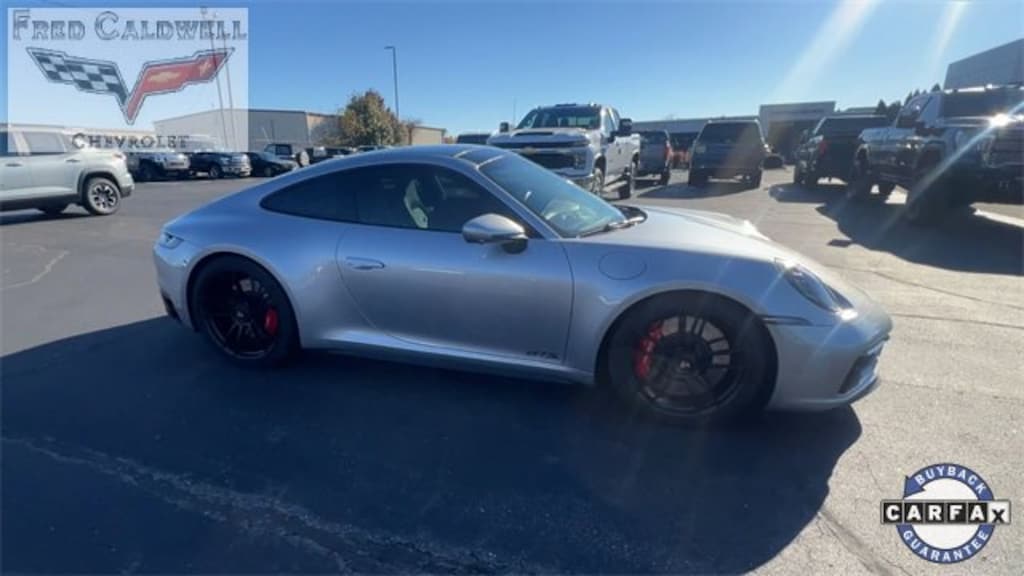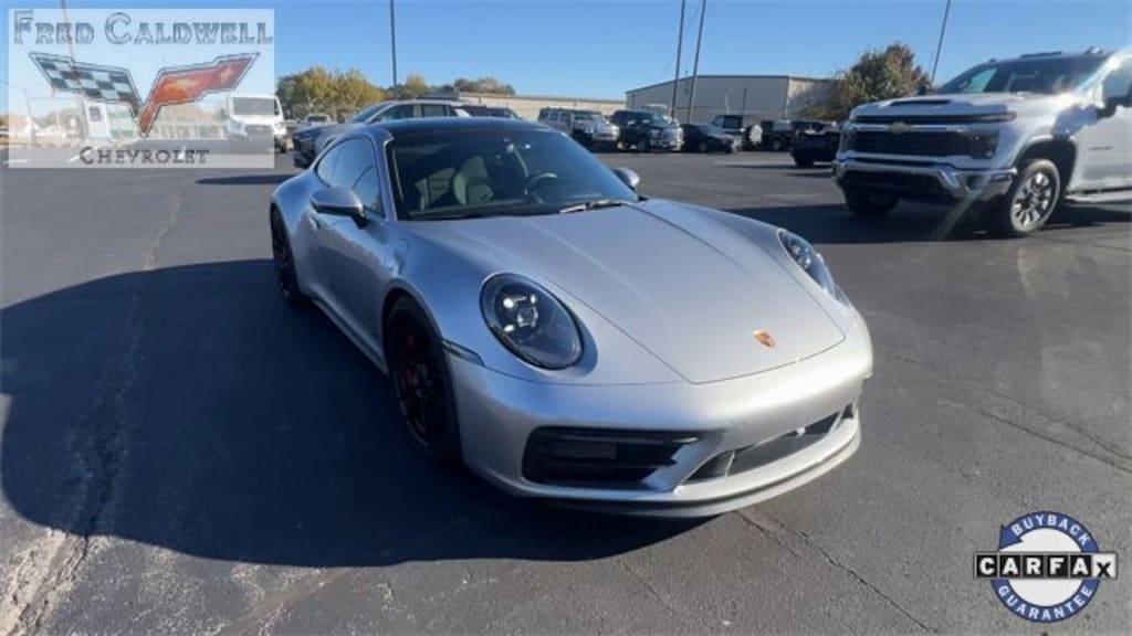 Clean CARFAX. GT Silver Metallic 2022 Porsche 911 Carrera 4 GTS AWD 8-Speed Porsche Doppelkupplung (PDK) 3.0L H6 Turbocharged DOHC 24V LEV3-ULEV70 473hp AWD, 4-Way Sport Seats Plus, 4-Wheel Disc Brakes, 8 Speakers, ABS brakes, Adaptive suspension, Air Conditioning, Alloy wheels, Auto High-beam Headlights, Auto-dimming door mirrors, Auto-dimming Rear-View mirror, Automatic temperature control, Brake assist, Bumpers: body-color, Delay-off headlights, Driver door bin, Driver vanity mirror, Dual front impact airbags, Dual front side impact airbags, Electronic Stability Control, Exterior Parking Camera Rear, Four wheel independent suspension, Front anti-roll bar, Front Bucket Seats, Front Center Armrest, Front dual zone A/C, Front reading lights, Fully automatic headlights, Garage door transmitter: HomeLink, Heated door mirrors, Heated front seats, Illuminated entry, Leather/Race-Tex Seat Trim, Low tire pressure warning, Navigation system: Porsche Communication Management (PCM), Occupant sensing airbag, Outside temperature display, Overhead airbag, Overhead console, Passenger door bin, Passenger vanity mirror, Porsche Communication Management, Power door mirrors, Power driver seat, Power passenger seat, Power steering, Power windows, Radio data system, Rain sensing wipers, Rear anti-roll bar, Rear fog lights, Rear window defroster, Remote keyless entry, Security system, Speed control, Split folding rear seat, Spoiler, Sport steering wheel, Steering wheel mounted audio controls, Tachometer, Telescoping steering wheel, Tilt steering wheel, Traction control, Trip computer, Variably intermittent wipers, Wheels: 20 Front/21 Rear 911 Turbo S in Satin Blk.